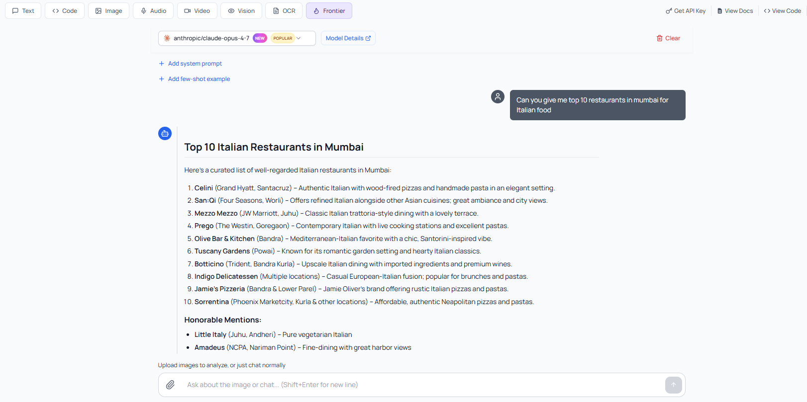 Step 2: Find both models in the Model Catalog and test them in the browser playground. Now, enter the prompt, for example: "Can you give me top 10 restaurants in Mumbai for Italian food"