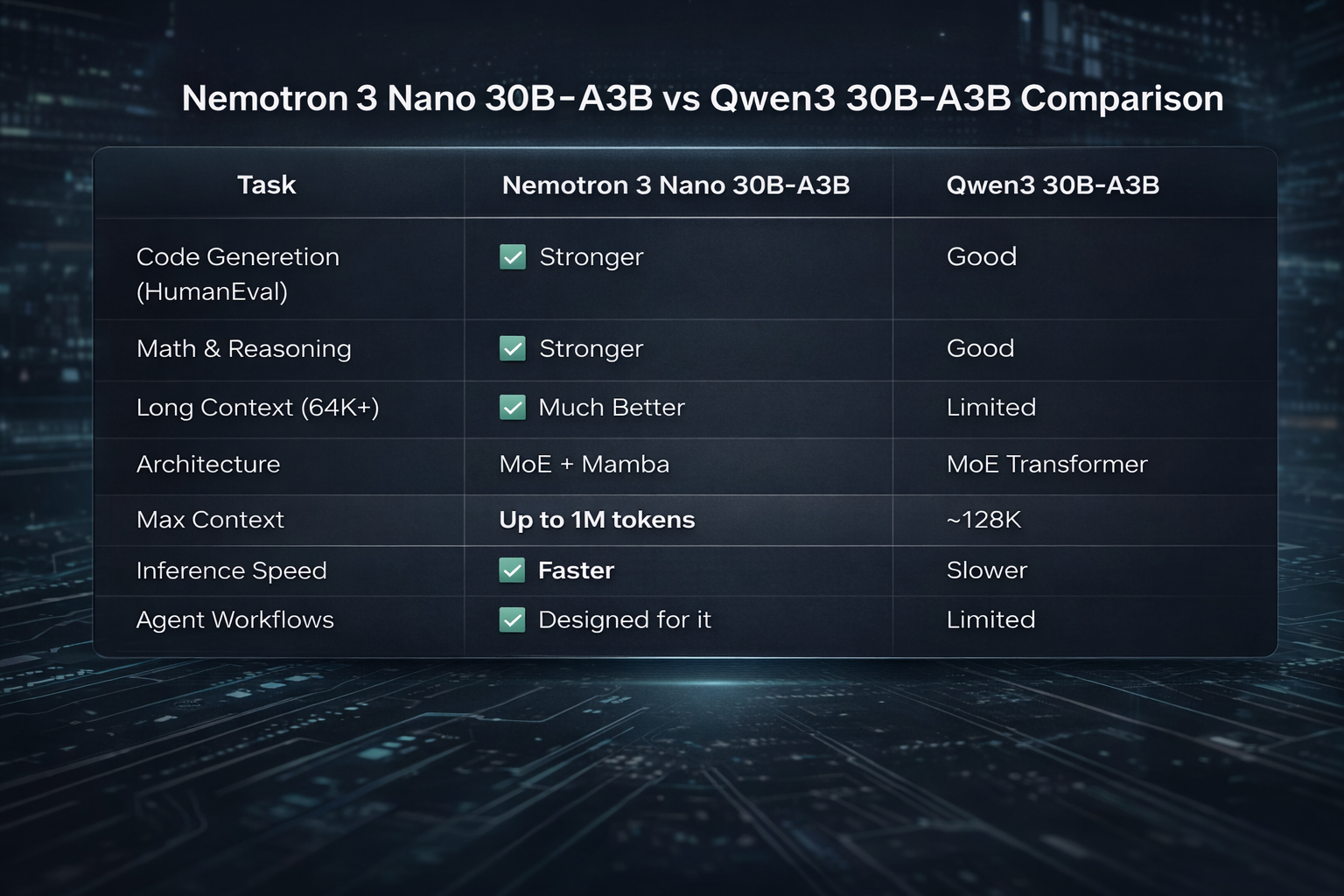 👉 Summary: If your workload involves long documents, reasoning, coding, or agents, Nemotron 3 Nano clearly wins.